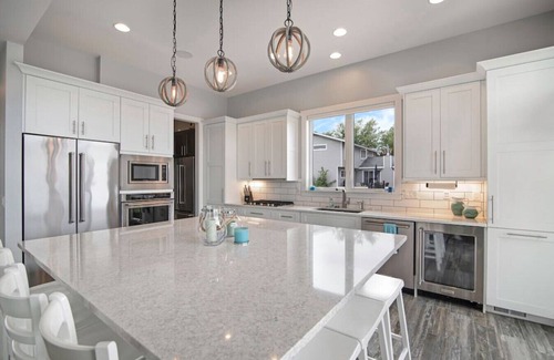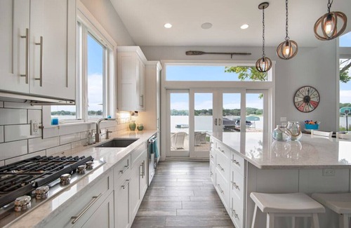 Kitchen - Gorgeous, fully decked out custom kitchen with massive island that comfortably seats 10 with direct access to the pantry / laundry room on the main level. Additional dining table area between the kitchen and great room that seats 4 to 6. The half bathroom is within steps of the kitchen, great room and main entrance. Exceptional views of the lake from the great room and kitchen.