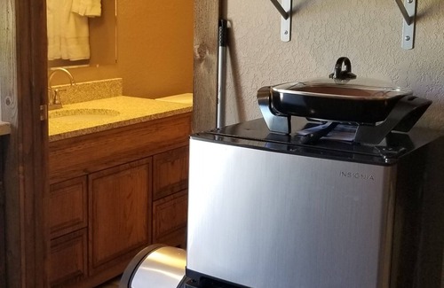 Has a kitchenette with microwave, dual coffee pot, electric skillet, toaster and 3.1 cu ft fridge.