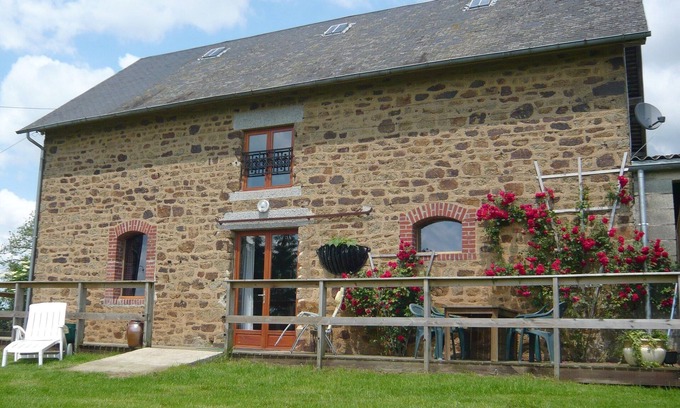 Les Cours is on the outskirts of the village of Lapenty and only 5 minutes drive from the popular market town of St Hilaire du Harcouet. On the ground floor we have a double bedroom with ensuite, suitable for wheelchair users including a wheel in shower with a seat and grab rails and a specially adapted WC. The kitchen and dining area are open plan with a lounge separated by the original stable mews woodwork. The first floor has a twin bedroom and a double bedroom with an additional shower room with toilet. Also a large landing area with a dedicated reading/quiet area.