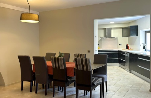 At the entrance we find a modern and wide kitchen, open to the dining/living room of about 30m2. On the left of the living room, we find a double bedroom with king size bed of 180 cm, and with a warm stone wall. Next to this bedroom, there is a big bathroom with shower.