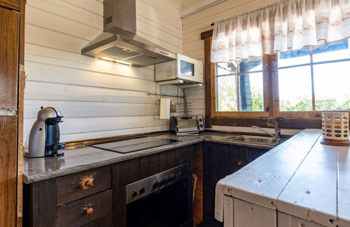 The smaller house sleeps 2, and it features one bedroom with a double bed, a bathroom with a shower, a living room and a kitchen corner.