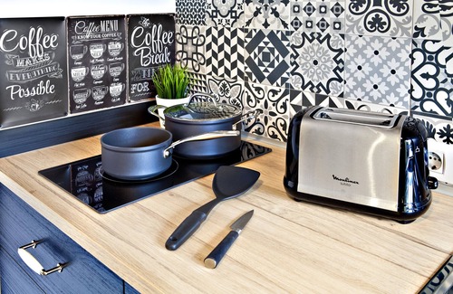 The kitchen is equipped with various kitchen utensils, such as microwave, coffee maker, refrigerator, utensils and crockery.