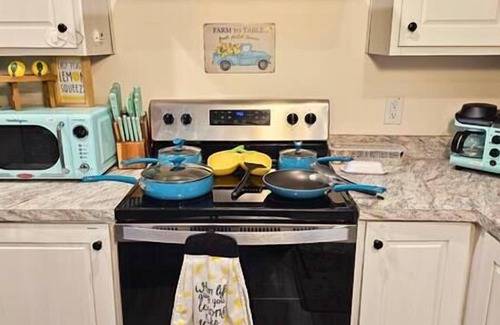 We like the kitchen layout so everyone can be involved in meal prep. The Dessert Station features a Snow Cone Maker, Airpop Popcorn Machine, Mini-Waffle Maker, and a Mini-Donut/Cupcake Maker. Dessert Making supplies & cleaning products are secured in cabinets with child safety locks(code provided in guestbook onsite).
