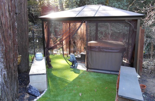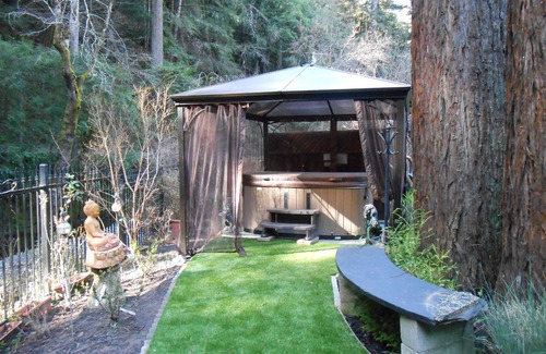 From the back patio you can gaze over a babbling winter creek and into the beautiful woods of Guerneville, the heart of the Russian River resort area. No detail has been spared for this luxury vacation rental and this attention to detail is what sets this rental apart. The main living space has an open floor plan with high ceilings, hard-wood floors, large dining room, comfortable furniture, and a large flat-screen TV. The fully equipped gourmet kitchen comes complete with granite counter tops and new modern appliances. Off of the two bedrooms, each with a private full bathroom, is glass doors leading out to a deck overlooking a babbling creek. An ideal spot to share a glass of the local wine. This amazing rental also features a flat-screen TV, DVD Player and library, WiFi, and side-by-side front loading washer and dryer for your vacation convenience. A gas barbecue grill is available to enjoy the wonderful outdoor seating area and a hot tub built for four awaits to relax your cares away.
