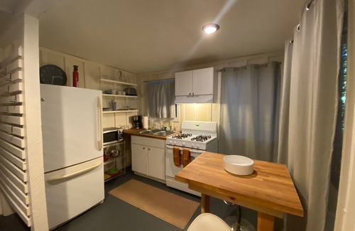 The main house is 2 bedrooms with a cozy living room and an updated kitchen and bathroom with a claw foot tub. There is a queen bed in one room, and a day bed in the other room that can be used as 2 twin beds or a full king. It sleeps 4.