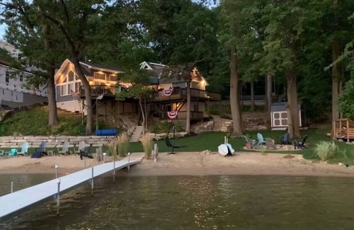 You’ll fall in love with this Gem!! Expansive property with 7 bedrooms and 3 bathrooms on almost a acre on the water! Parking for 10 cars on property. 116 feet of sandy beach on Round Lake. This Lake house has a massive 1400 sqft entertaining deck with built in tiki bar, natural gas grill dart board and entertainment area. Catch the best sunsets from the multi level deck. Whole house Sonos system. All your water needs. Kayaks, 5 person peddle boat, beach volleyball, water basketball, bags. Swim out island for the kids or adults to layout. We have all the sand toys the kids will need. Floats, noodles and rafts for the kids. 15’ Fire pit gathering for 15 people for the best roasting marshmallows event!! 20 foot tree swing that the kids will have endless hours of fun. Jungle gym coming 2022. Huge lawn on waterside to play football, soccer baseball or whatever your heart desires. Take a nap in the hammock where your sure to fall asleep in the shade right by water ?