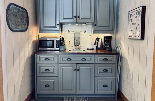 Perfect for a cozy retreat, our cottage boasts a queen-sized bedroom, a spacious bathroom with heated floors, and a comfortable living area. The well-equipped kitchenette includes a fridge/freezer, off-site larger chest freezer, microwave, toaster-oven, drip coffee maker, kettle, along with all cookware and dining essentials. While it's not a full-size kitchen, you'll find everything you need for meal preparation, including an electric frying pan, induction cook-top burner, and slow-cooker. Relax in the living room with a plush sofa and a 43" Smart TV, or step outside onto the covered porch to enjoy the propane BBQ and soak in the serene surroundings. Additional outdoor amenities include a hammock, outdoor table & chairs, propane BBQ, and fire pit. For convenience we also have a full-size washer & dryer in the utility room for longer stays.