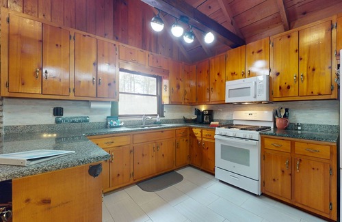 Step inside to find a cozy interior featuring a gas fireplace, central AC, and all the amenities you need for a relaxing stay. The cabin boasts a well-equipped kitchen with modern appliances, a spacious living room with a TV for entertainment, and a gas fireplace to keep you warm on chilly evenings. The cabin also offers a washer/dryer for your convenience, ensuring a stress-free stay.