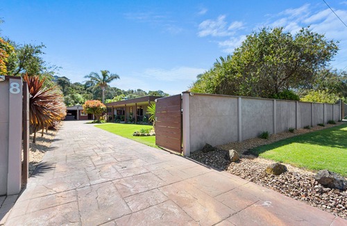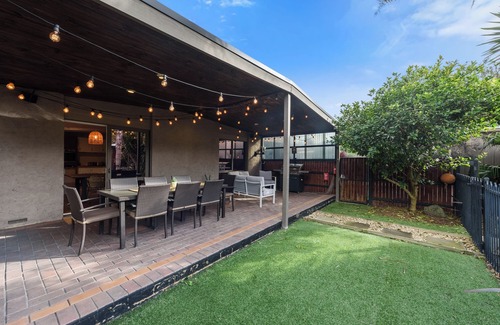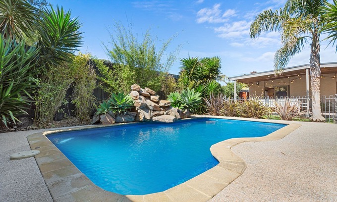 Private Outdoor Oasis: Your guests can unwind in the beautifully landscaped garden, featuring a solar heated swimming pool and an outdoor undercover area with BBQ facilities, all adorned with enchanting fairy lights.
