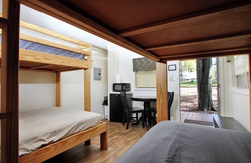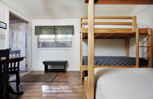 Cabin 27 is located near the back of the campground. This cabin has two bunk beds which include 1 full Bed & 3 twin Bunks. We will provide fresh sheets on the bed, however we will not provide pillows and blankets, or towels. This cabin sleeps a maximum of 5 adults and has Self controlled window air conditioning unit, space heater, Microwave, Mini-fridge, Fire Ring, Picnic Table, ceiling fan, table and chairs. Please note that this cabin DOES NOT HAVE ANY RUNNING WATER. However it is just a short walk from our heated bathhouse with hot showers and toilets. We do allow pets in this cabin if they are under 35 pounds. (There is an additional fee of $20.00 per pet per night). This cabin is NON SMOKING. Check in time is any time after 3 pm.