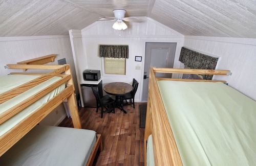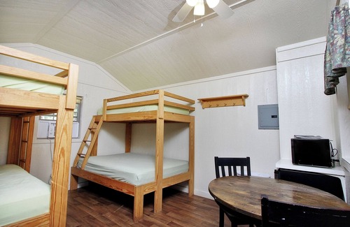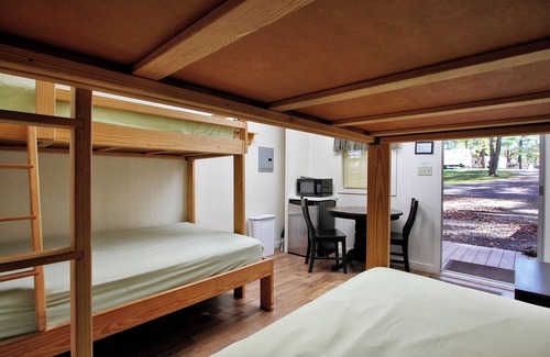 Cabin 28 has 2 bunk beds with 1 full Bed & 3 twin Bunks. We will provide a fresh fitted sheet on the bed. However we will not provide pillows and blankets, or towels. The cabin sleeps a maximum of 5 adults. It has a Self controlled window air conditioning unit, as well as a space heater, and ceiling fan. It includes a Microwave, Mini fridge, and table and chairs. The cabin has its own Fire Ring, and Picnic Table. Please note- THERE IS NO BATHROOM, SHOWER OR RUNNING WATER inside the cabin but our heated bathhouse is just a short walk away with toilets and hot showers. This cabin is NON SMOKING. We allow any size pet in the rustic cabin. (There is an additional fee of $20.00 per pet per night) FREE PARKING! FREE WIFI!