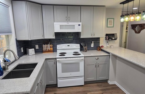 Inside, you'll find a welcoming living room with a cozy futon for extra guests. The house is recently remodeled with a cabin in the woods feel. Inside, there is a great bar top for playing games, sipping drinks, and sharing stories with friends and family.
