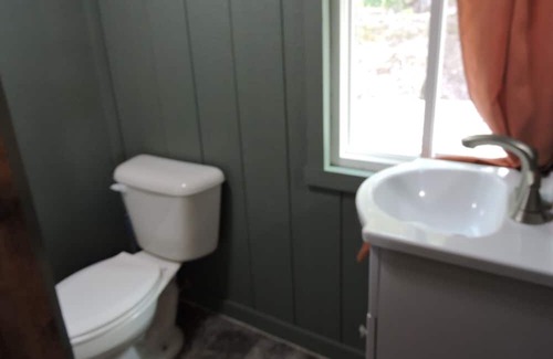 The cabin can accommodate up to four guests and includes one bedroom and one newly updated full bathroom with a shower. The bedroom is located in the loft area and is furnished with 2 full-size beds, 2 large chest of drawers and flat-screen TV equipped with satellite channels. The kitchen area comes equipped with a table for 4, refrigerator, a gas stove top, a microwave, basic table setting, utensils, a coffee pot & keurig. In the evening, guests can chill out on the sofa in the cozy living area while watching the large flat-screen TV that comes with satellite channels. Outside, guests can spend some quality time on the covered porch while gazing at the starry night sky.