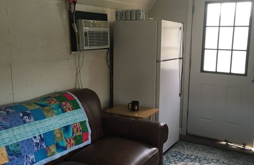 One room cabin sleeps 5-6 with 2 bunkbeds (one full-size), comfy leather couch, full refrigerator, M/W, coffee pot, heater, A/C, USB outlets. The shower house & restrooms are a short walk behind the cabin in the campground adjacent. Most of your time will probably be spent outdoors at the river or visiting nearby attractions, such as Washington-on-the-Brazos State Historical Site or lovely downtown Navasota.