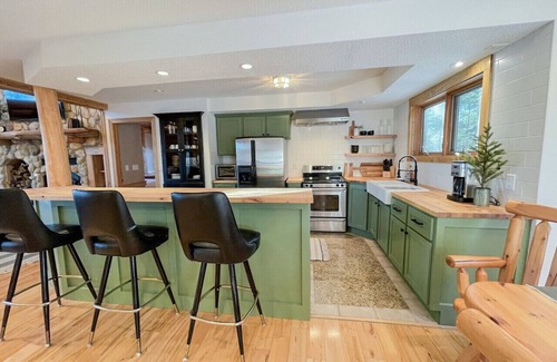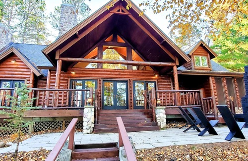Enjoy your lakefront getaway in this newly renovated, rustic log cabin. With two outdoor fireplaces, three indoor fireplaces, and a view of the pines through every window, this cabin makes for a cozy retreat no matter the season. The cabin has 3.5 bathrooms and sleeps 13 with a master bedroom, upstairs bedroom, loft, and basement for plenty of sleeping room for the whole family.