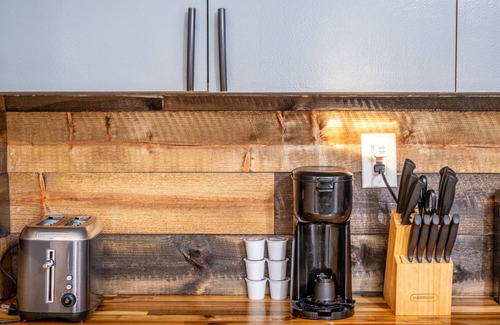 The kitchen features custom wooden countertops and a large island, perfect for cooking and gathering with family or friends. The living room offers a 70” Smart TV and a wood stove, creating a cozy space to relax after spending time outdoors.