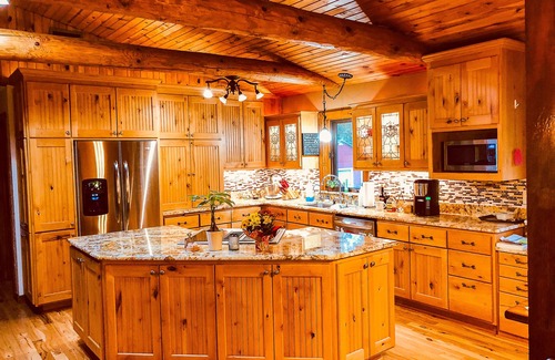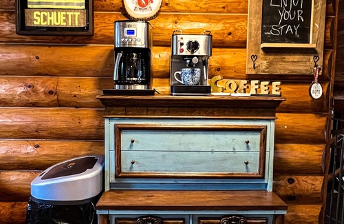Cabin is open to guests. Some small areas will be closed off. Guests will have access to master bedroom, lower level bedrooms, two full baths, kitchen, living room, rec room, fireplace room. Free parking on private driveway. We will have a shelf cleared in the fridge for guest use. This is our primary residence and we want to share the log home with guests to make lasting memories in.