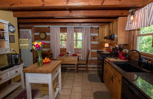 Guests enter the cabin through the well-equipped eat-in kitchen featuring: gas stove, dishwasher, microwave and side by side refrigerator, Vitamix blender, coffee station with Keurig Coffee maker & Nespresso espresso maker with pods, creamers, various sweeteners, teapot with assorted tea bags, 4qt crockpot, toaster, cookware, glassware, serveware, kitchen towels, potholders, utensils, cutting boards center island, food wraps & storage bags, bakeware, mixer, mixing bowls, spices, dinnerware, silverware, pantry with a full range of treats and a few convenience foods. The refrigerator houses an assortment of nonalcoholic beverages, basic condiments & dairy products. If you have special dietary needs, would like us to receive and put away grocery deliveries, or shop for you let us know so we can accommodate. Special occasion? Let us spoil you with a local surprise! In a rush? Fix a coffee to go with disposable cups and lids. We’ve thought of everything!