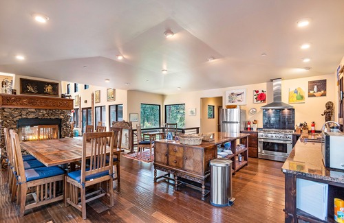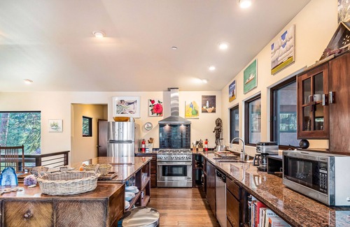 Influenced by the Prairie-Style, your home is simple and functional, with natural stone trim from the property and granite kitchen countertops and furnished with an uncluttered Asian-influenced esthetic reflecting the owners’ many years overseas in the Far East. The large great room has the core of a Javanese house architecturally incorporated, separated by custom stone work from the adjacent gourmet kitchen and spacious dining area. Completing the main floor is a spacious bedroom with a queen bed and tasteful bathroom with private forest views.