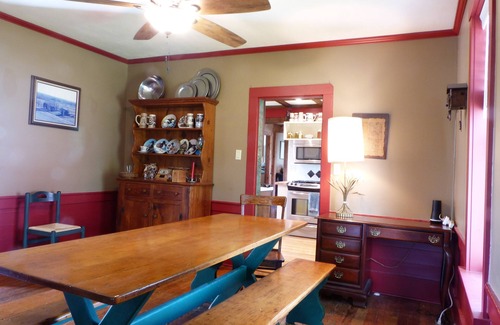 The dining room features a large family table with benches that can seat up to 10 people and a hutch for serving.