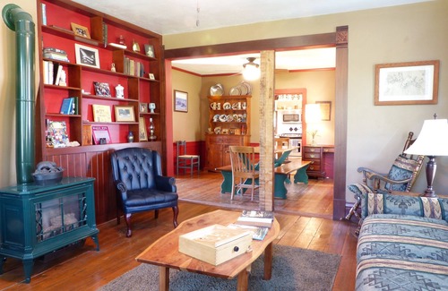 The living room has a large country sofa and a handmade cherry coffee table and a gas stove for cozy extra warmth.