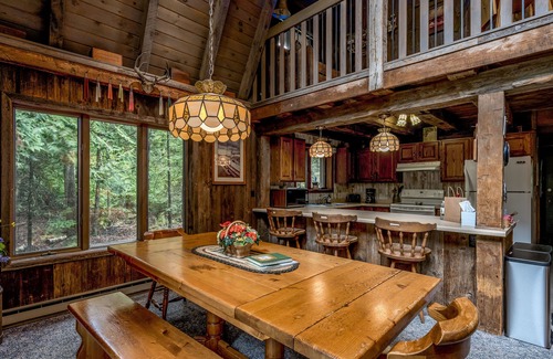 The house sleeps 8. It includes 3 bedrooms and 2 full baths. The master bedroom is on the main floor with a King bed. The bathroom on the main floor has a shower and jacuzzi tub. There are two bedrooms on the second floor; one with a Queen bed and the other with 2 Twin beds. The bathroom upstairs has a bathtub/shower combination. The upstairs loft overlooks the family room and has a view into the forest with a Queen sleeper sofa. The kitchen has typical appliances as well as a microwave, dishwasher, coffee maker, toaster, blender, crockpot and all the utensils, cookery and plates/glassware you should need. The dining area has a table for 8 and 4 stools under the kitchen peninsula. The family room has a Smart TV with YouTubeTV and WIFI. Heating is electric so each room can be set individually. There is AC for the main area on the first floor and also have ceiling fans and extra fans in the closet. Outside is a patio deck, picnic table, a couple of chairs and a Weber charcoal grill.