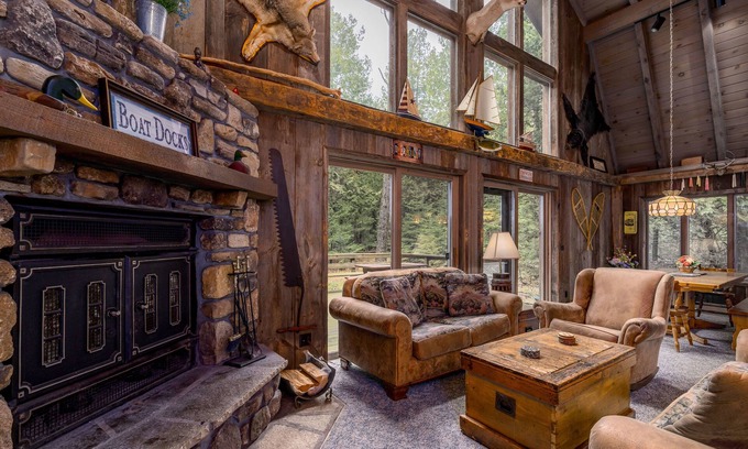 Our log home was built in 1984 with hand-hewn logs from the surrounding woods. As you enter the home with beams and walls covered in wood from an 1820's barn you begin to feel the stresses of everyday life melt away. The soaring 24 ft cathedral ceiling and grand stone fireplace welcome you into the family/dining area and the adjacent wall of windows looks out at the surrounding wilderness where deer, raccoons, squirrels and birds can be viewed from the comfort of the home. We have installed new ductless A/C in the main room on the first floor in 2022 for your comfort. New carpeting has been installed throughout the cabin in June 2024.