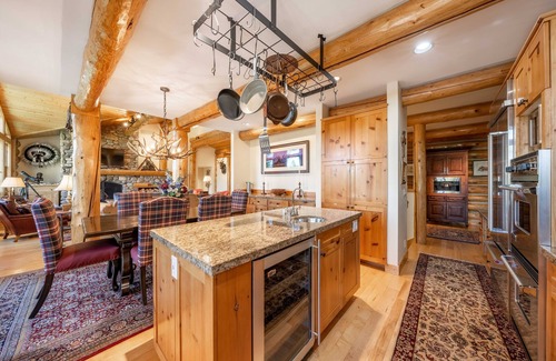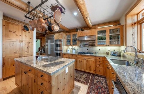 Located in Cottonwood Creek Canyon, The Kicking Bear matches the standard of luxury accommodation with a Western motif unique to Jackson Hole. The area is often visited by wildlife. Our home's forested location gives its guests an escape into a mountain wonderland and lets them live their log cabin dreams to the fullest. The log walls and vaulted ceilings immerse you into the calm of nature. The two levels lets friends and family spread out into the home's four bedrooms.