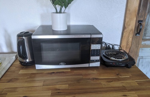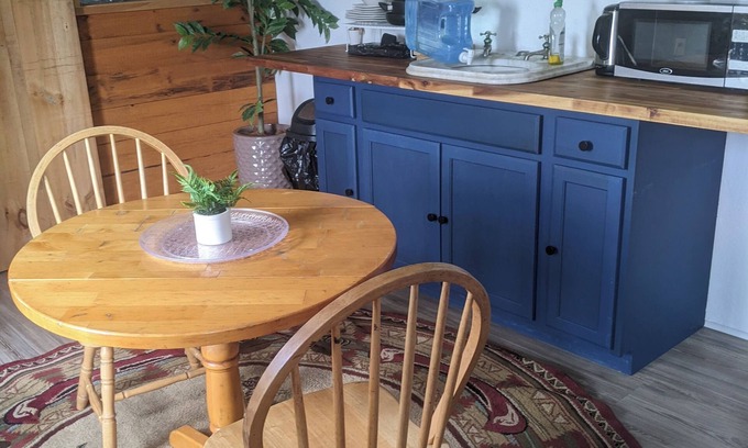 Our barn studio features one bunkbed (full and twin), a kitchenette, a dining table and chairs. There is NO RUNNING WATER. No shower. Drinking water is provided and a tank to wash off above a sink.