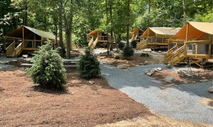 Experience the great outdoors in style in a Glamping Tent at Wilderness Cove Campground. Nestled in the picturesque mountains of Saluda, North Carolina, these luxurious tents are perfect for nature lovers who want to escape the hustle and bustle of the city. With a comfortable queen-sized bed, cozy furnishings, private covered patio and outdoor fire pit, you'll have everything you need to relax and unwind in nature.