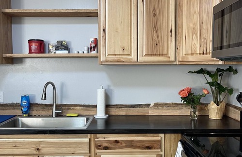 Our bathroom marries functionality with rustic charm. Equipped with a modern washer and dryer, it ensures the conveniences of home are at your fingertips. The spacious shower invites you to unwind after a days adventure, while the classic vanity adds a touch of timeless style to your daily routines.
