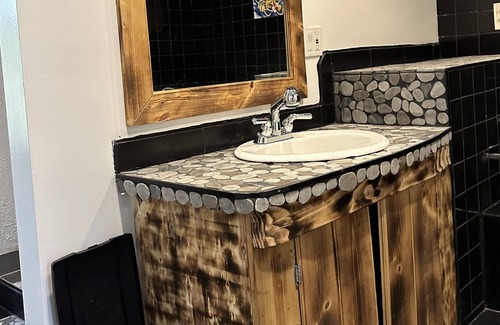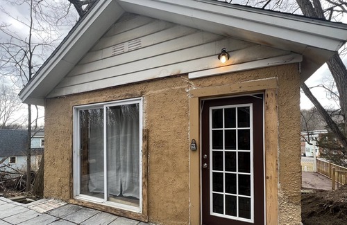When you arrive you will walk up the left side of the house to the upper back patio. 1 bd apt. with king size bed. Full bath remodel, bathtub , standup shower. Refrigerator/freezer in living area. Large couch. Wireless internet. Large flatscreen TV on stand that you can move to any room. We can provide a blowup mattress if needed for more guests. 4 people could comfortably stay. There is a microwave, air fryer, toaster oven, crockpot. A stand up rack to hang clothes. Hangers provided, towels & washcloths provided. Linens provided. Pets are welcome, just let us know :) there is a front porch off of the main bedroom facing the house, and the back patio has table, chairs , and a grill can be provided.