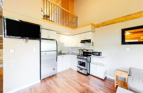 Immerse yourself in peace and serenity at this Lac Le Jeune Wilderness Resort cabin. Just minutes from a recreation center and its namesake lake, this waterfront property showcases scenic year-round beauty in the heart of British Columbia. Blending rustic charm and contemporary comfort, this classic log cabin features a one-bedroom-plus-loft layout with all the comforts of home including a full kitchen, baseboard heating, and complimentary internet access. Enjoy the outdoors with coffee or cocktails on the private deck and after the day's adventures, unwind at home with some casual entertainment on the satellite TV. The shared on-site washer/dryer adds convenience during your stay.