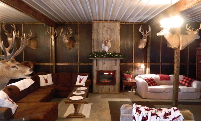 Southern Ohio Hunting Lodge with all the comforts of home. Large kitchen and island, dining area, full bath, and living room in an open floor plan where you can enjoy a full body massage chair. Upstairs is a full length loft with 3 beds and a living room. Enjoy the view sitting on the large back porch and the aromas of food on the grill. There are 2 cabins each with a Queen bed and a private full bath. Enjoy the outdoors and make smores in the camp fire area behind the cabins. Relax with nature in the added luxury of a 6 person hot tub in an outdoor lighted cabana.