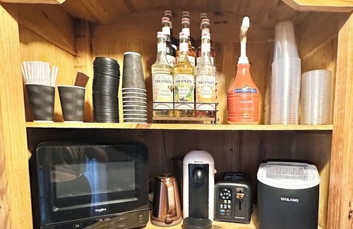 The kitchen is equipped with all the necessities to cook. You will also find a fully stocked breakfast bar that has a toaster, tea kettle, Nespresso machine, ice maker, and microwave. I’ve stocked it with 9 flavored syrups so you can try a new fun latte or coffee every morning.