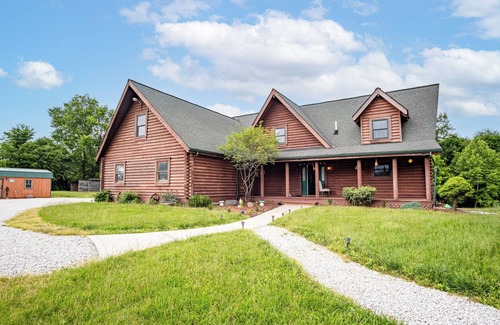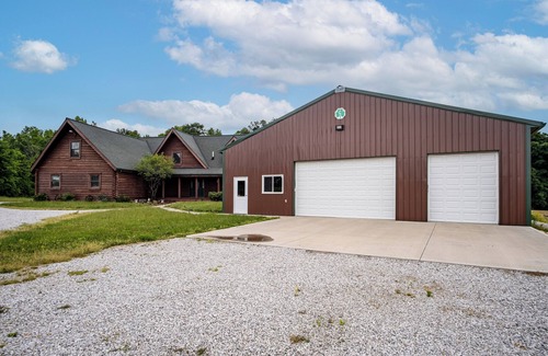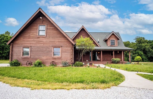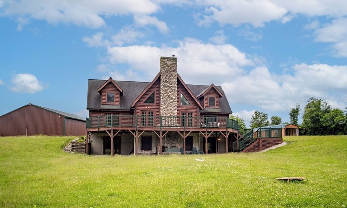 Welcome to Rustic Log Retreat on Eleven Acres which sleeps 24. Nestled in a serene and secluded setting, our authentic log home offers the perfect escape. Enjoy picturesque views of a beautiful pond, and ultimate relaxation. Inside, you’ll find cozy rustic charm with modern amenities and games for entertainment. Come unwind and make lasting memories at our beautiful log cabin on over eleven acres! Parties prohibited unless approved. There is a barn with Pickleball court, tables and chairs to accommodate 70 people, movie theater, two fridges, bar counter and additional TV, fans lights etc. This is rented for a separate price.