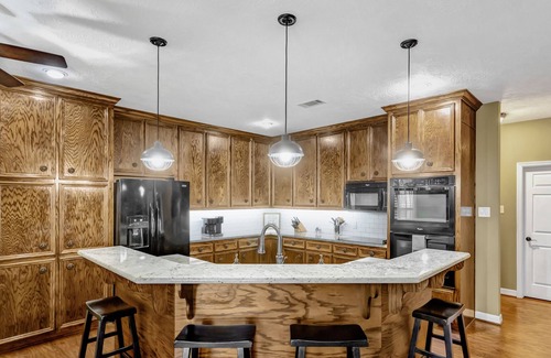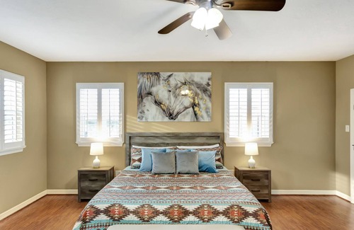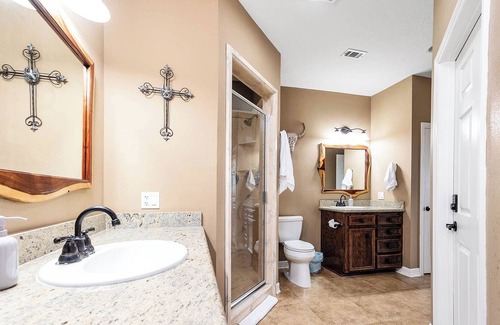 The Rustic Manor (main house): The main house has 4 bedrooms/3.5 baths and comfortably sleeps 14 people! One king bed, two queen beds and a bunk bed with two full size beds. The heart of the home features a ranch-style kitchen with an island and bar seating which opens into the living and dining areas giving a spacious and open feel. Entertain and socialize with ease throughout your stay in the versatile and comfortable space. Plantation shutters throughout allow in an abundance of natural light, complimented by double French doors leading to the outdoor and pool area. Enjoy the commanding views and seamlessly transition between inside and outside of the main house. The over-sized utility room with laundry, folding table, hanging rod, large basin sink, and ample custom cabinetry, provides our guests with convenient storage, helping larger groups with efficiency and organization during their stay. This bonus room also has a half bath and private door to the pool area, which enables pool users to keep water in its designated place and out of the main house.