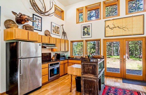 Influenced by the Prairie Style, your guesthouse is simple and functional, with red oak floors and granite kitchen countertops and furnished with an uncluttered Asian-influenced esthetic reflecting the owners' many years overseas in the Far East. The large great room has the kitchen, dining, and socializing. Completing the main floor is the main bedroom with a bed under a Javanese wall carving and the recently remodeled bathroom with private forest views. The basement affords access to the main floor and the washer/dryer.