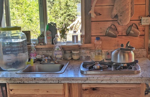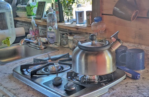 There is a full sized bed with space for storing luggage underneath. All linens, blankets and towels are provided. There is a cooler for storing your food and all kitchen amenities are provided. There is a propane stove top and propane heater for chilly nights.