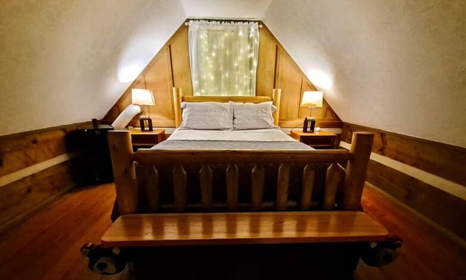 Upstairs in the cozy loft is a queen-sized bed nestled beneath vaulted ceilings, while a full-sized futon downstairs offers additional sleeping space. The cabin also features a large jacuzzi tub, perfect for soaking away stress after a day of hiking, exploring local wineries, or scenic driving along the Parkway.