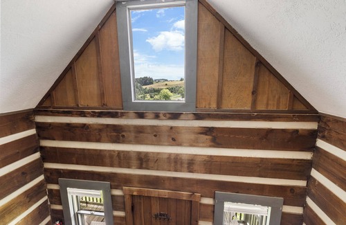 Upstairs in the cozy loft is a queen-sized bed nestled beneath vaulted ceilings, while a full-sized futon downstairs offers additional sleeping space. The cabin also features a large jacuzzi tub, perfect for soaking away stress after a day of hiking, exploring local wineries, or scenic driving along the Parkway.