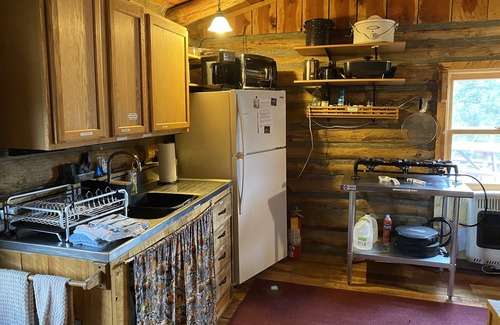 Kitchen area has a Refrigerator with freezer on top, 3 burner propane cook top, drip coffee maker, crock pot, electric skillet , microwave, large toaster oven, and 2 slice toaster. Dishes, flatware, Pots and pans provided. Inside Dining area seats 6. We provide coffee, filters, creamer, sugar, ketchup, mustard, salt and pepper for your use. Outside propane BBQ grill with side burner.