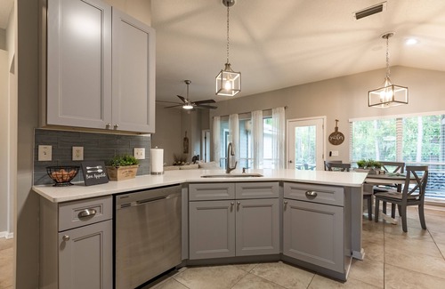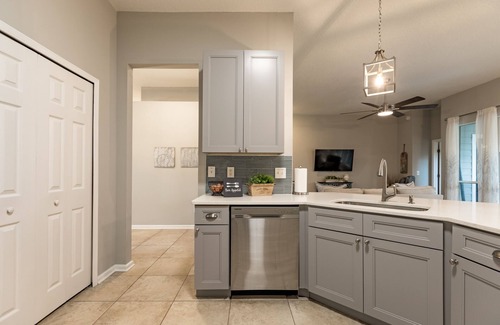 New cabinets with quartz countertops, new appliances with both keurig and a standard coffee pot. Large closet pantry with a few staples to get you started for your stay. The breakfast table has a butterfly leaf and will seat 6 comfortably. The counterheight penisula has two bar stools.