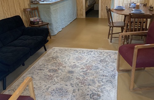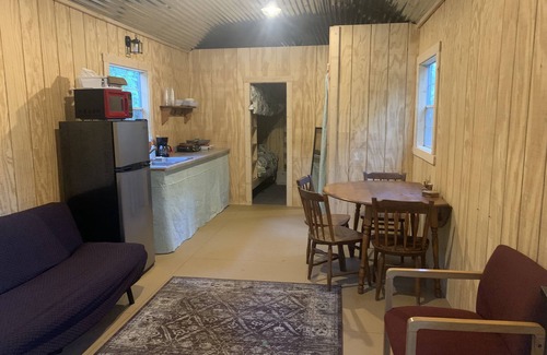 Enjoy your time away and relax in the great outdoors! Our rustic Cabin is private with its own personal fire pit and outdoor area as well as having a plenty of space indoors! There are also more outside accommodations as well, a shower house, outdoor games, and a group area is available as shared space! If you choose to walk through the woods you can hear the babbling brook nearby!