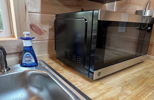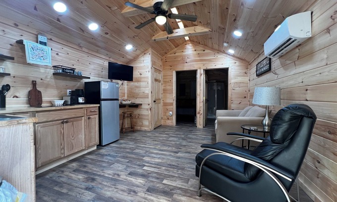 The cabin features a comfortable bedroom with a queen-size memory foam mattress, ensuring a restful night’s sleep after a day spent exploring or relaxing in nature. This cabin also has a full-size futon in the living room, equipped with one of the top-rated mattresses for futons, ensuring extra comfort and quality sleep for additional guests. The living space is thoughtfully designed to combine country charm with convenience, offering all the essentials you need for a perfect stay.