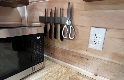The kitchen is equipped with a versatile microwave (serving as an air fryer, convection oven, and broiler), a built-in two-burner stovetop, Keurig coffee maker, toaster, plates, utensils, and more. Linens, including fresh sheets and towels, are provided for your comfort, so you can settle in stress-free.