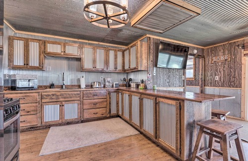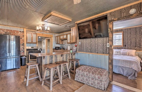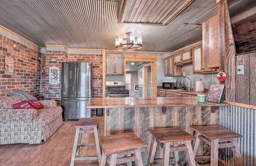 Bring the family or friends on a one-of-a-kind retreat at this 2-bedroom, 1-bathroom Flemington cabin located steps to Pomme De Terre Lake. Featuring unique metal paneling and wood accents, this rustic vacation rental provides the perfect snug home base between your activities. Start your day with a cup of coffee on the porch. Then, go fishing or swimming in the lake, explore the nearby hiking trails, and check out the Lucas Oil Speedway. Return to a Smart TV, full kitchen, free WiFi, and more!