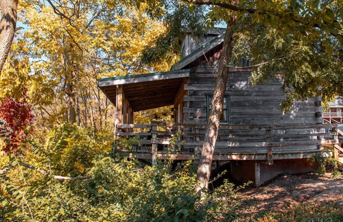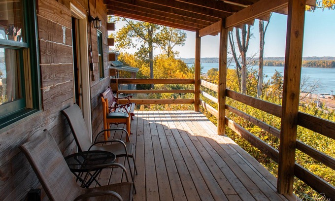 Rustic River Cabins offer a view and space that anyone could appreciate. The cabins sit high on the Mississippi River bluffs surrounded by nature and a one of a kind view of the river below. Located seconds for historic downtown Savanna IL and the Mississippi Palisades State Park. Located near a public boat ramp and plenty of room to park boats. Each cabin has 2 queen beds located in the loft overlooking the living area below. The living area features a futon that can also be used as a queen bed, allowing the cabin to sleep up to 6 people. Each cabin has a full kitchenette with fridge/freezer, stove top, oven and sink. Full size bathroom including a shower. Every cabin has a large covered porch with seating and a view. Cabins have rustic feel but feature all modern amenities including central air, heat and hot water. The whole cabin is available, including outdoor space with a grill, firepit, and picnic table.