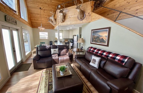 Two-bedroom, One bath cabin. Queen-sized bed in Master, Upstairs loft is furnished with Two-queen-sized beds and sitting area. Living room furnished with a recliner sofa and love seat, a gas log fireplace, flat-screen TV, WiFi and a cabinet full of games. Ceiling to floor windows over looking the river. The kitchen is fully equipped with all cooking utensils, refrigerator, oven, microwave, dishwasher and coffee maker. Enjoy the large fire pit area with plenty of seating for everyone in addition to a hammock for your afternoon liesure. The front deck is the perfect place for your morning coffee overlooking the river while birdwatching. Enjoy fishing and relaxing off the private dock not to mention a community walk-in river access for fly fishing.