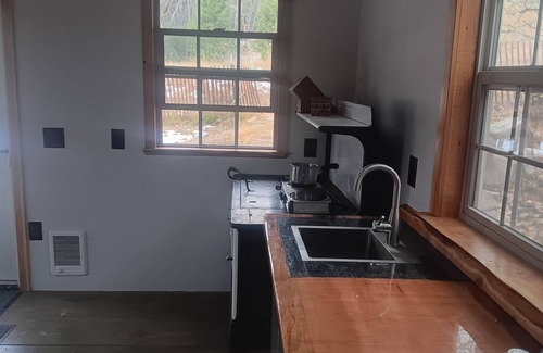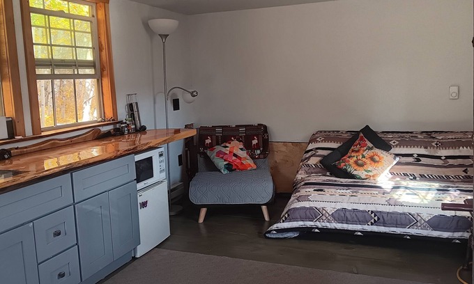 Enjoy this scenic, rustic cabin featuring one futon and 1 sm. pull out single bed all on main floor. Electricity all around and hot and cold running water in kitchenette. Composting toilet out back. No shower. Next to public land; Quiet, private and warm and cozy.